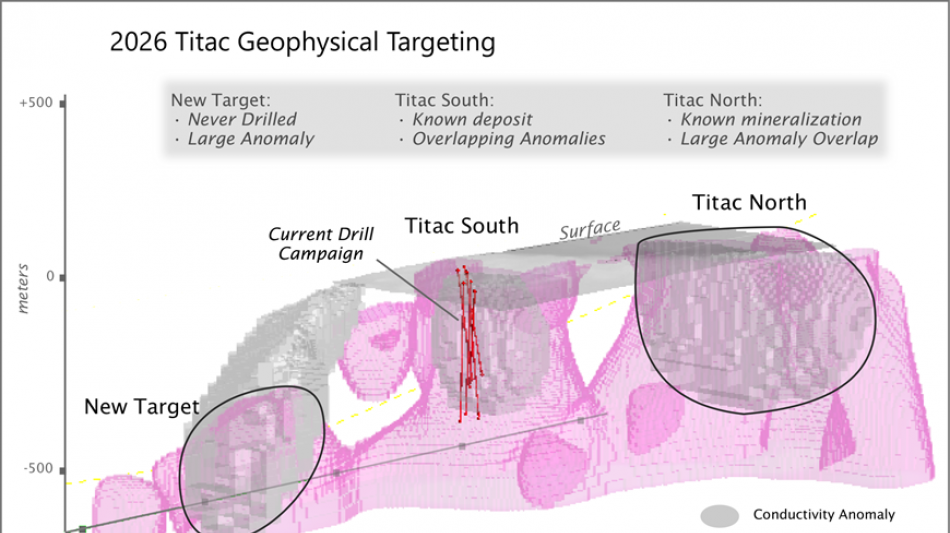 Drill testing of a newly identified deep conductive and magnetic anomaly south of Titac South