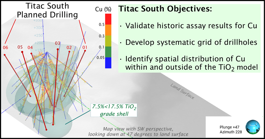 The program represents the first phase of targeted drilling designed to evaluate and expand on copper mineralization associated with the Titac South deposit, which hosts an existing titanium dioxide mineral resource, as outlined in the NI 43-101 Technical Report dated September 18, 2024, prepared for the Company by Apex Geoscience (and available on the Company's profile at www.sedarplus.ca)¹.