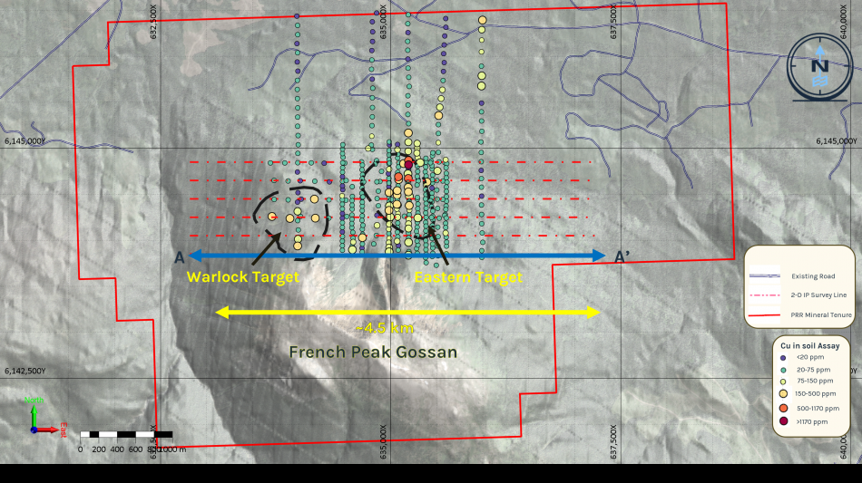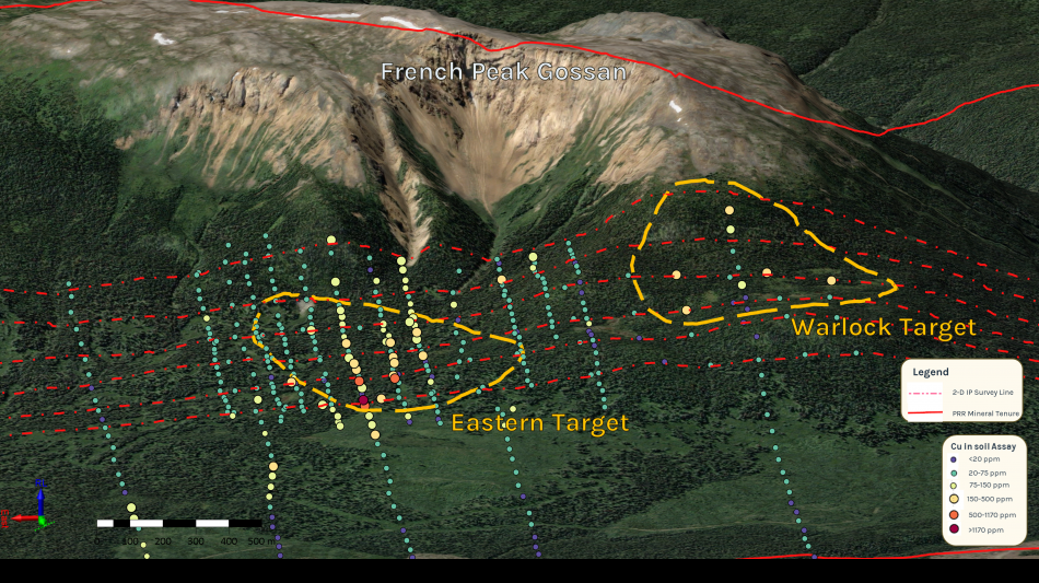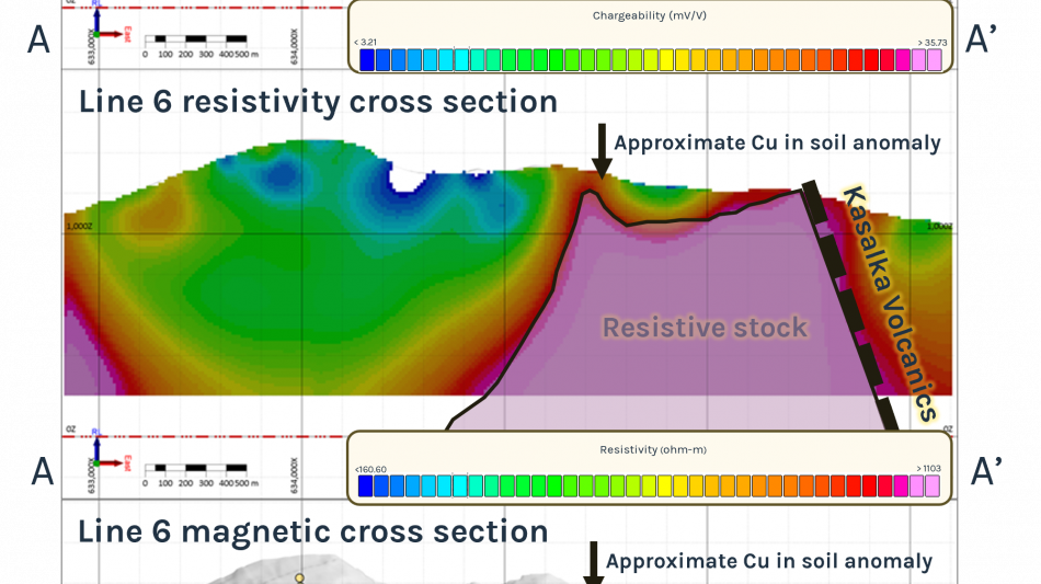 The IP survey successfully identified a geophysical target that measures ~ 1 km x 2 km defined by coincident chargeability, resistivity, and magnetic responses. This geophysical target overlaps with the copper in soil anomalies collected in previous exploration campaigns and during the summer 2025 program. Together, these results suggest a strong potential for porphyry-style mineralization.