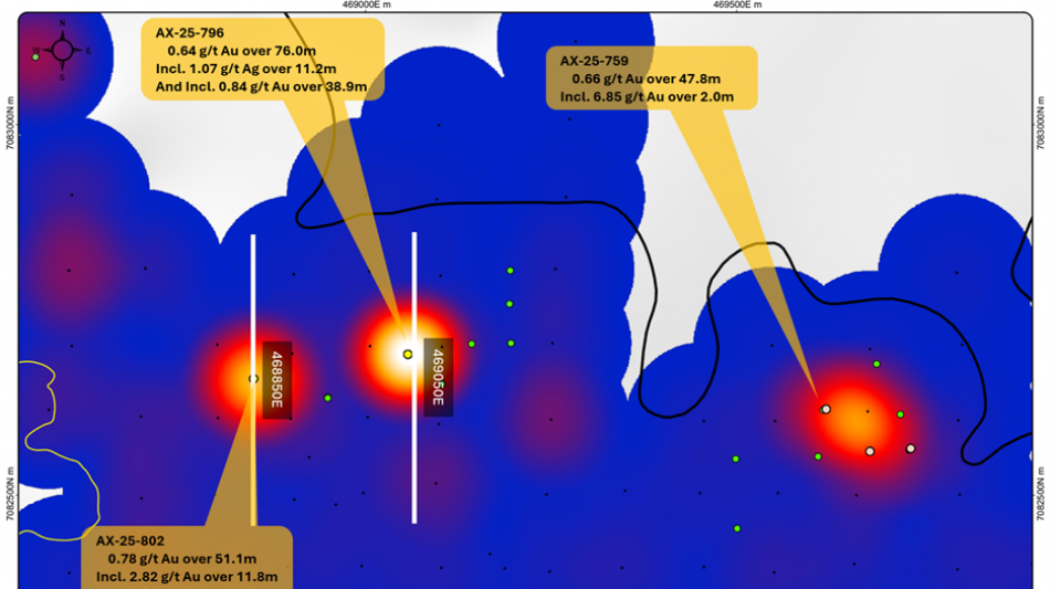 AX-25-796 - 0.84 g/t Au over 38.9m within 0.64 g/t Au over 76.0m; including high-grade intervals of 26.35 g/t Au over 0.5m,