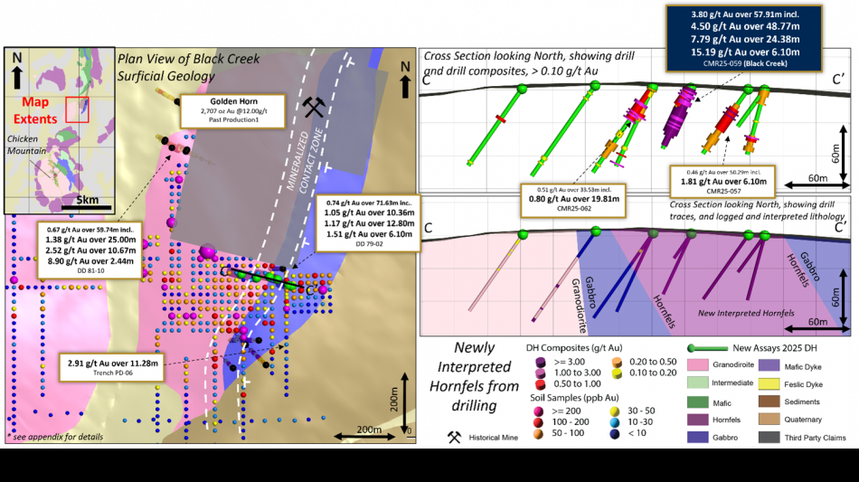 Our first pass drilling at Black Creek is transformative for several reasons. Hole CMR25-059 returned 4.50 g/t Au over 48.77 metres with 7.79 g/t Au over 24.38 metres beginning at surface, hosted in hornfelsed sediments along the intrusion margin. Importantly, this confirms high-grade gold in a fundamentally different host rock than the monzonite-dominant mineralization we have defined at Chicken Mountain and Alpha Bowl.