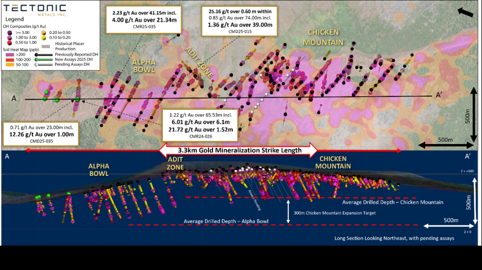 Alpha Bowl drilling extends Chicken Mountain-Alpha Bowl mineralized strike length to 3.3 kilometres - remains open in all directions