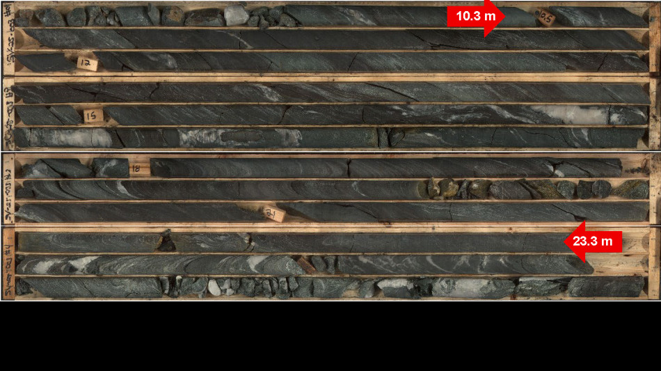SV-25-003: 39 metres of target mineralization was intercepted beginning at 2.65 metres downhole, with multiple intervals over 5 metres in width up to 13 metres.