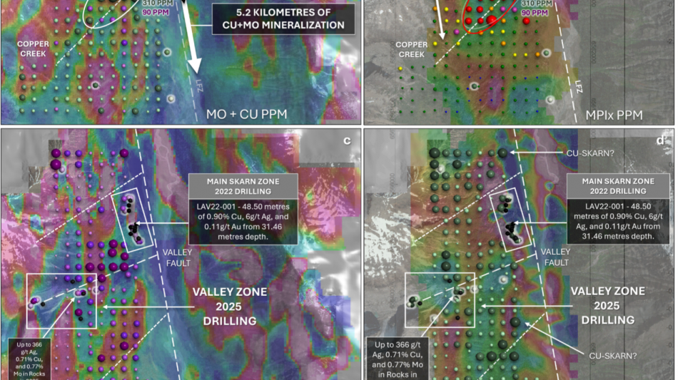 Key soil anomalies coincide with areas of previous drilling, including the Valley Zone and Main Skarn Zone, strengthening confidence in continuity of the mineralized system.