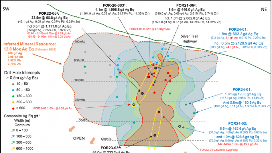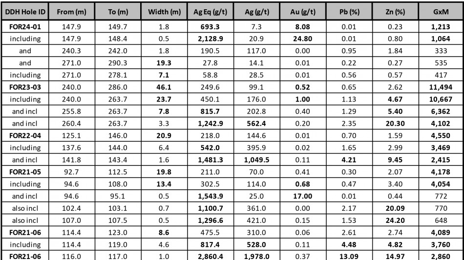 Impressive past drill results: FOR23-03 returned 46.1 m grading 249.6 g/t Ag Eq (99.1 g/t Ag, 0.52 g/t Au, 0.65% Pb, and 2.62% Zn), for a grade thickness of 11,494 gram-meter ("GxM"), with multiple internal higher-grade zones including 3.3 m of 1,413 g/t Ag Eq (562.4 g/t Ag, 0.20 g/t Au, 2.35% Pb and 20.3% Zn) (see Table 1).