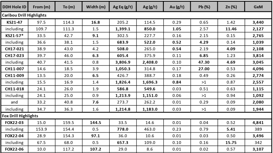 Table 1 - Summary of Significant Keno Silver Project Drill Results (Caribou, Fox, Homestake Target Areas)