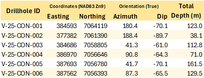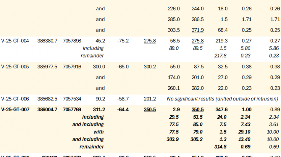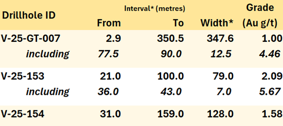 Geotechnical and Condemnation Drilling: The 2025 geotechnical program at Valley successfully collected data that support mine planning scenarios under evaluation while increasing confidence for future resource estimation. Analytical results for gold are presented in Table 3. Notably, geotechnical hole V-25-GT-007 returned 1.00 g/t Au over its entire 347.6 m length from bedrock surface, ending near a prospective, open zone of mineralization on the northwestern edge of the Valley deposit.