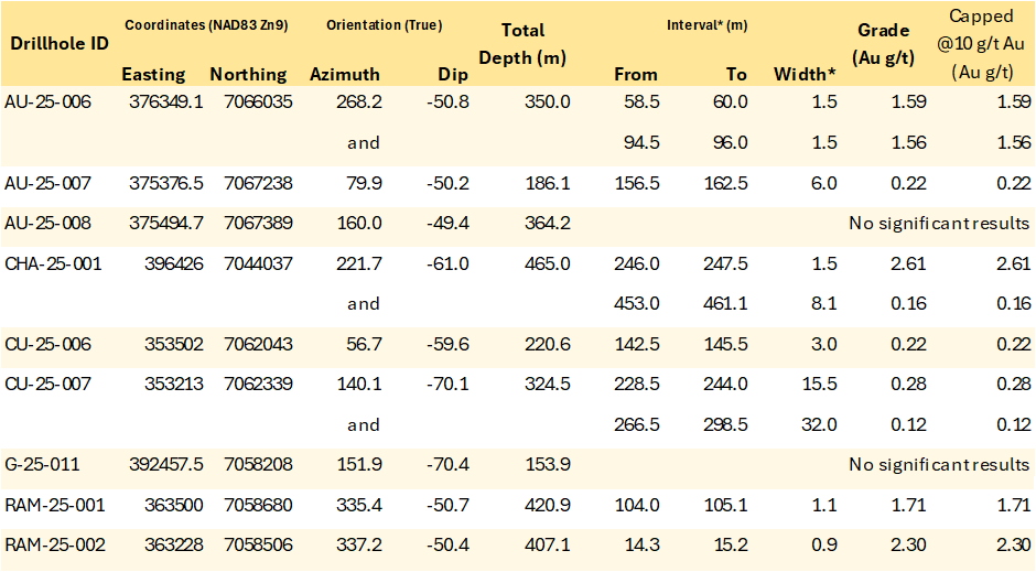 Table 2 - Anomalous gold intervals in drillholes V-25-148 through V-25-157 from the Valley deposit. Underlined numbers indicate end-of-hole values within mineralized intervals. Holes V-25-148, 149, 152 & 156 are from the new zone of mineralization on the eastern side of the Valley intrusion. *Interval widths shown.