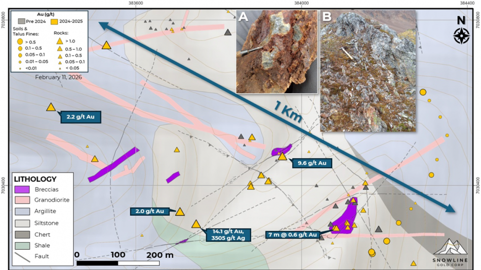 Crossroad Target: Reconnaissance prospecting, soil sampling and mapping on the Cynthia Project led to the discovery of a new mineralized zone named the Crossroad target, located roughly 27 km south of Valley and 10 km from the Plata Winter Trail (Figures 2 and 4). Gold mineralization has been encountered in surface samples from an area of 1,000 x 300 m, with selective grab samples returning up to 14.1 g/t Au and 3,505 g/t Ag (including elevated Bi, Cu, Fe, Pb, Sn, Te & Zn values), along with a chip sample across a 7.0 m outcrop which returned 0.6 g/t Au. Mineralization is hosted within altered siltstones and argillites as well as hydrothermal breccia units and granodioritic dykes. The Crossroad target is located along the same structural corridor as Snowline's "Intersection" target, also on the Cynthia Project, along a prospective five-kilometer trend with multiple outcrops showing reduced intrusion-related mineralization. The Company will continue surface evaluation of Crossroads and the broader corridor in 2026 to define potential drill targets.