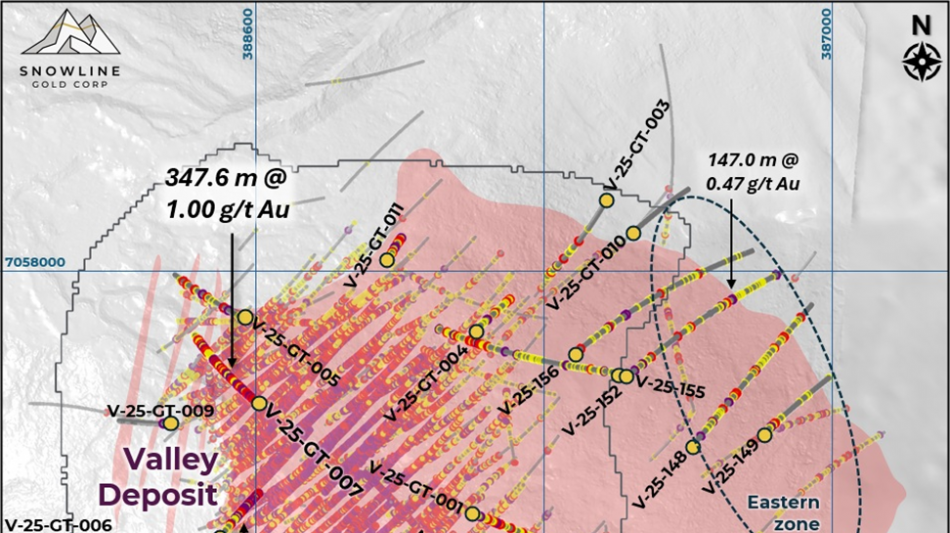 "We continue to see consistent gold from surface at Valley along with an expanding mineralized footprint to the system," said Scott Berdahl, CEO & Director of Snowline. "Results from infill and geotechnical drilling are expected to inform reclassification of high value, near-surface mineralization for inclusion in our ongoing Prefeasibility Study. Results from exploration holes drilled in the eastern part of the Valley intrusion add significant scale while highlighting the potential for additional high‑grade centres in untested parts of the intrusion. Beyond Valley, regional drilling and the new discovery of mineralization at Crossroad on the Cynthia Project increase the opportunities within our regional exploration pipeline. As we advance Valley through prefeasibility and towards permitting, we aim to build on our exploration progress by confirming multiple mineralized centres in a new Canadian gold district."