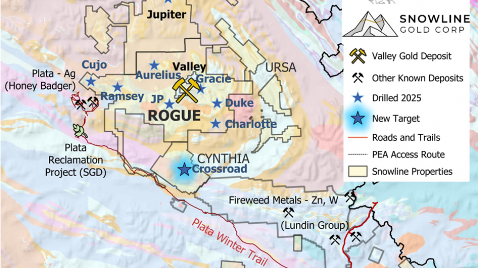 VANCOUVER, BC / ACCESS Newswire / February 11, 2026 / SNOWLINE GOLD CORP. (TSX:SGD)(OTCQB:SNWGF) (the "Company" or "Snowline") is pleased to report additional analytical results from its 2025 exploration program, including exploratory, infill, geotechnical and condemnation drilling for its Valley deposit ("Valley") on its flagship Rogue Project in the eastern Yukon Territory. Results highlight ongoing resource de-risking through successful infill drilling of higher grade, near-surface mineralization and outline an extensive zone of lower grade mineralization outside of the current resource. Open edges of the system point to untested, prospective areas with the host intrusion for future drill testing. The Company also reports results from five regional drill targets on its Rogue Project and the discovery of a new mineralized target - Crossroads - on its Cynthia Project, where selective grab sampling returned values up to 14.1 g/t Au and 3,505 g/t Ag. Regional drilling and surface results are being used to guide targeting for Snowline's upcoming 2026 exploration program.