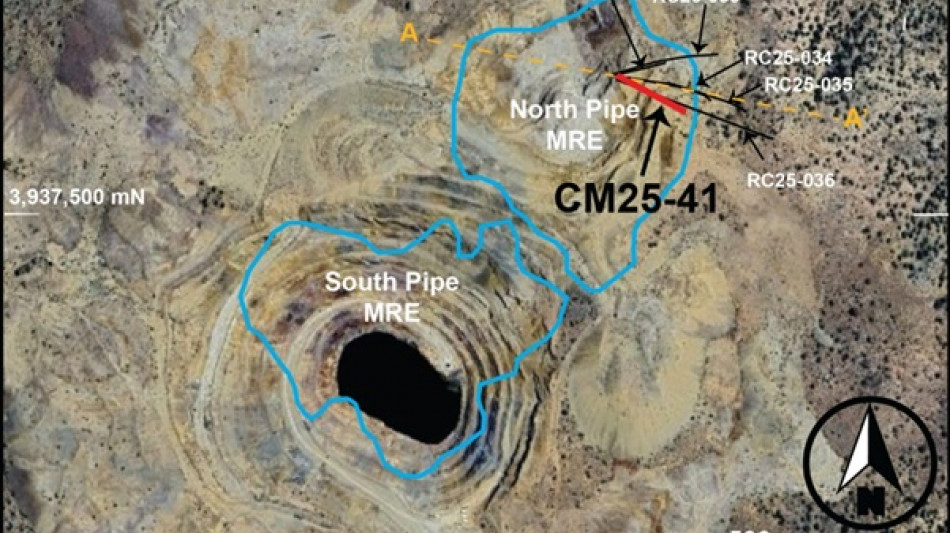 The northeast extension of the North Pipe has been progressively defined through a series of reverse circulation (RC) and diamond core holes (DD) drilled during 2025. The latest result from CM25-41 adds further confidence to gold grades within this emerging zone and supports the continuity of mineralization along the northeast portion of the breccia system.