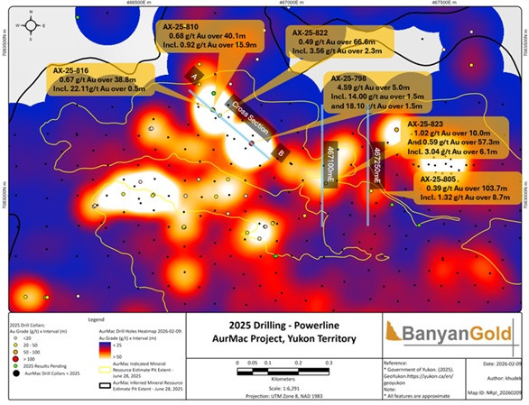 VANCOUVER, BC / ACCESS Newswire / February 17, 2026 / Banyan Gold Corp. (the "Company" or "Banyan") (TSXV:BYN)(OTCQB:BYAGF) is pleased to announce it has intersected high-grade gold ("Au") mineralization and visible gold ("VG") in numerous intervals in central Powerline Deposit ("Powerline") at its AurMac Project ("AurMac"), Yukon, Canada.