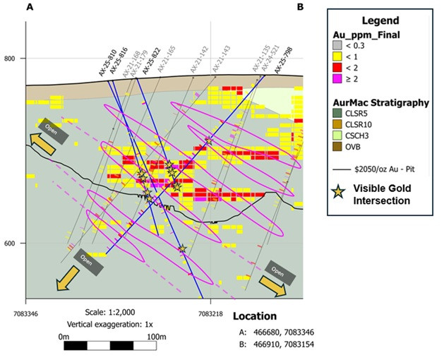 "These high-grade intersections from Powerline continue to strengthen the continuity and to define the high-grade portions of the deposit, supporting the refined geologic and mineralization model, the upcoming Resource update and Preliminary Economic Assessment," said Tara Christie, President and CEO. "Visible gold associated with high-grade intervals was identified in every drill hole in this release across an over 500m long zone of the center of Powerline (from AX-25-810 to AX-25-805). These results highlight the continued potential for expanding near surface, high-grade mineralization."