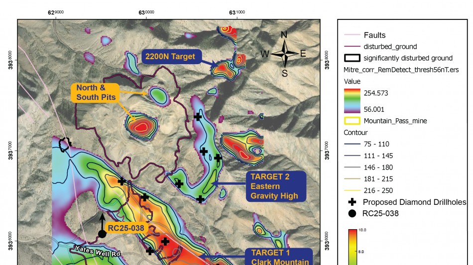 Carbonatite Diamond Drilling: Twelve drillhole locations have been finalized to test the Clark Mountain Fault Zone (Target 1) and Eastern Gravity (Target 2) anomalies.