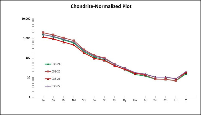 Figure 4: Chondrite Normalised Plot of the four samples collected in RC25-038 showing a smooth, lanthanide distribution profile with no negative europium anomaly, characteristic of mantle-derived alkaline magmatic systems.