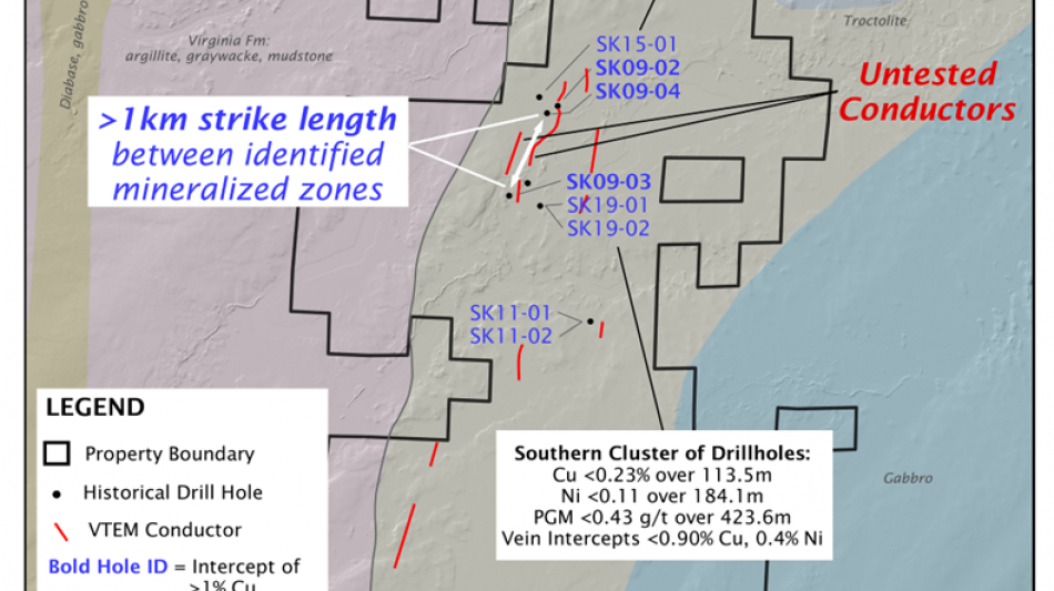 The presence of massive and semi-massive Cu-Ni-PGM intervals at Skibo has been indicated by the resampling program of historical drill core. The goal of this program was to target unsampled intervals above and below historical assay intervals that report high-grade zones. Sampling of the historical drill core is expected to allow the Company to evaluate whether disseminated mineralization halos exist and to assess their spatial relationship to mapped electromagnetic conductors.