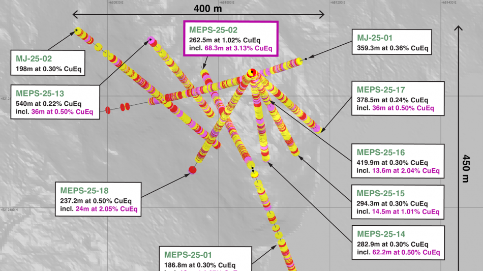 New high-grade zone associated with the GFP felsic porphyry dykes and adjacent magnetite veining at shallow depths in holes MEPS-25-14, 15 and 16, including a highlighted interval in MEPS-25-16 of 13.55m grading 2.04% CuEq from 96.35m depth within a larger interval of 177.3m of 0.4% CuEq and a broader interval of 419.9m of 0.3%CuEq.