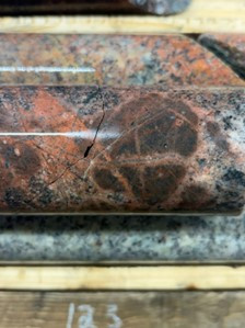 Based upon visual core logging, the stock is so far principally composed of a granite porphyry to quartz monzonite porphyry intrusive, compositions that are common to many major porphyry copper systems worldwide. The porphyry contains abundant phenocrysts of feldspar (plagioclase and orthoclase) and quartz with common but lesser mafic phenocrysts (hornblende and biotite). The common presence of both primary igneous hornblende and biotite (Figure 4), both hydrous minerals, in this felsic porphyry is indicative of a 'wet' hydrous source magma that is critical to the late-stage development of abundant, metal-rich, hydrothermal fluids that are ultimately responsible for the mineralization of copper and other metals in porphyry copper systems typically as sulphides within veins crossing the stock and intruded country rocks.