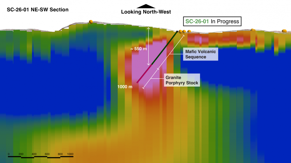 Drillhole SC-26-01 was designed to test a ZTEM resistivity low geophysical target in proximity to bornite and chalcopyrite exposures in outcrop and as a large step-out to the MEPS Discovery (Figure 1 and 2).