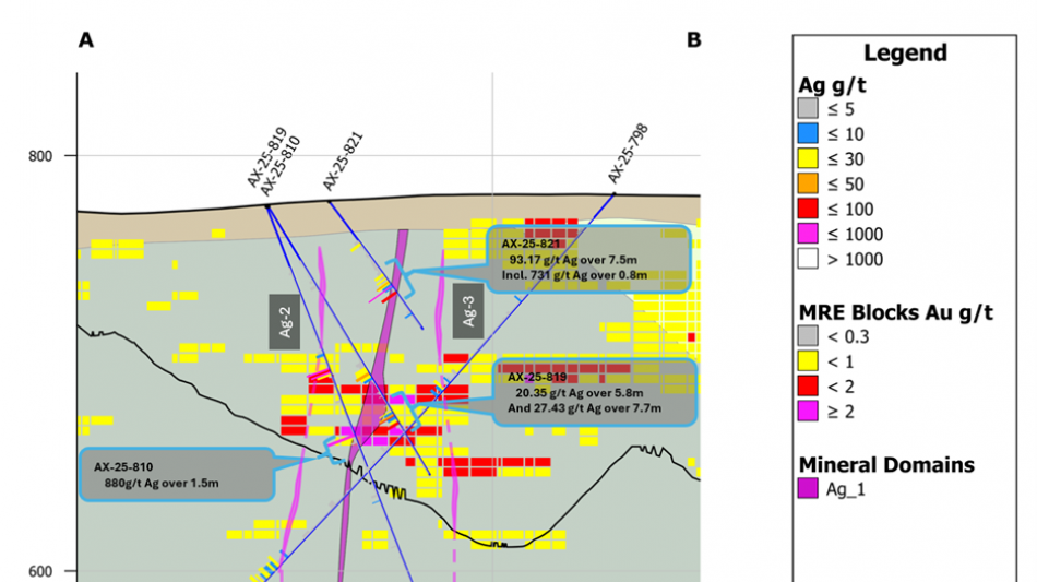 AX-25-821 - 731 g/t silver over 0.8m within 93.17 g/t silver over 7.5m
