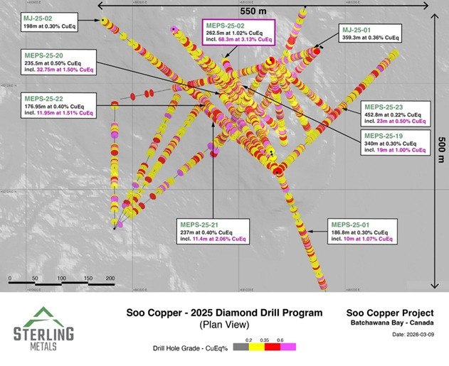 TORONTO, ON / ACCESS Newswire / March 16, 2026 / Sterling Metals Corp. (TSXV:SAG)(OTCQB:SAGGF) ("Sterling" or the "Company") is pleased to report the remaining assay results from its expanded and completed 2025 drilling program at the Soo Copper Project ("Soo Copper" or the "Project") located near Batchewana Bay, Ontario. Results from five additional drill holes continued to expand the copper mineralized footprint, while further defining and extending the high-grade bornite zone discovered in September 2025, revealing a new bornite-covellite zone to the northwest (Figures 1 and 2).