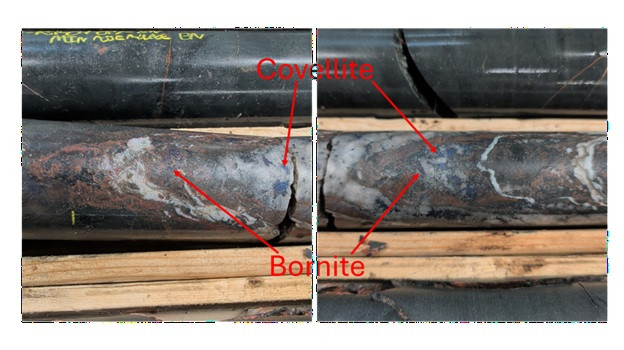 Holes in this release highlight a transition to bornite-covellite mineralization with increasing gold grades hosted by stronger quartz veining in the northwest part of the MEPS Discovery area. Robust quartz veining containing bornite and covellite was discovered 120m from the core of the original discovery bornite zone, where the final 11.95m of MEPS-25-22 graded 1.51% CuEq ending at 364m downhole within a broader interval of 176.95m of 0.4% CuEq from 188m downhole.