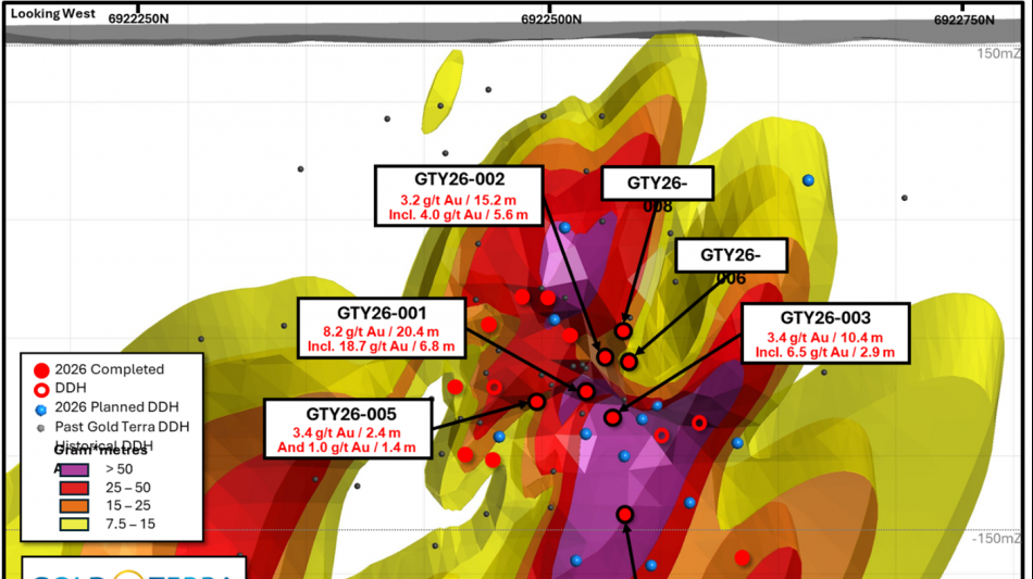 VANCOUVER, BC / ACCESS Newswire / March 17, 2026 / Gold Terra Resource Corp. (TSXV:YGT)(Frankfurt:TX0)(OTCQB:YGTFF) ("Gold Terra" or the "Company") is pleased to announce assay results from the first seven (7) holes of the 2026 Winter Drill Program targeting the Yellorex zone immediately south of the past producing Campbell Shear (CS), historic Con Mine (1938-2003). The current drilling program aims at confirming some historical holes to expand Gold Terra's near surface 2022 Mineral Resource Estimate (MRE) on the Con Mine Option property. Assay results are shown in Table 1 and include drill hole GTY26-001 which intersected 8.20g/t Au over 20.35metres from 242.5 metres to 262.85 metres downhole, including 18.7 g/t over 6.8 metres starting at 254.75 metres