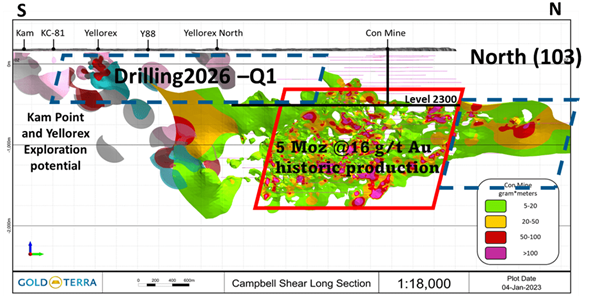 Chairman and CEO, Gerald Panneton, commented, "With Gold Terra's last MRE completed in 2022 based on a US$ 1750 gold price, our winter drill program of 10,000 metres in the Yellorex area of the Campbell Shear (CS) will be looking to confirm and expand Gold Terra's estimate of the near surface resource from surface to 500 metres below surface on the CMO property. This first batch of drill results confirm the potential continuity of the zone, as Gold Terra requires additional holes to seek more ounces in the indicated category. The Campbell Shear structure is our highest priority target as the Con Mine produced historically more than 5 million ounces of high-grade gold (16 g/t Au) (see Oct. 21, 2022 Technical Report)."