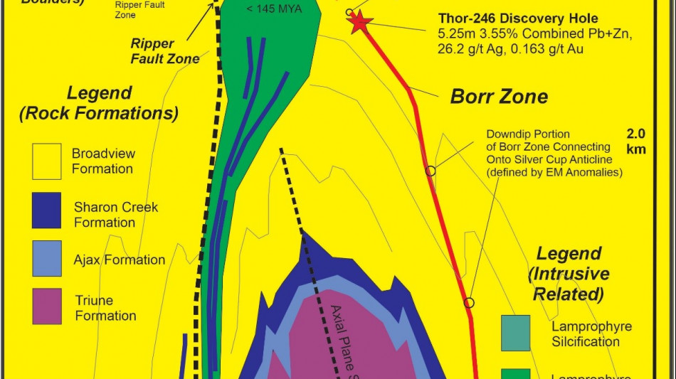 Like the main Thor deposit, Borr is a tabular zone that dips moderately (~45 degrees) northeast parallel to the mountain side and extends down to Ferguson Creek. Just below Ferguson Creek, the regional-scale Silver Cup Anticline plunges NW under the Thor property. Subsurface modeling of geology and EM shows that the roots of the Borr Zone extend into the apex and flanks of the Silver Cup Anticline. The prospective target at Borr is important because, if it is contiguous, it represents an area approximately five times the size of the existing Thor deposit.