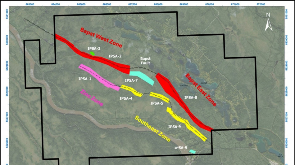Primary targets for advanced exploration (IPSA-2, IPSA-8) are high-priority, structurally controlled anomalies, directly associated with the Bapst fault. Secondary targets (IPSA-1, 4, 5, 6) are located in the zinc zone and southeastern area, representing subordinate, lower-contrast induced polarization (IP) anomalies requiring follow-up. (Fig. 2).