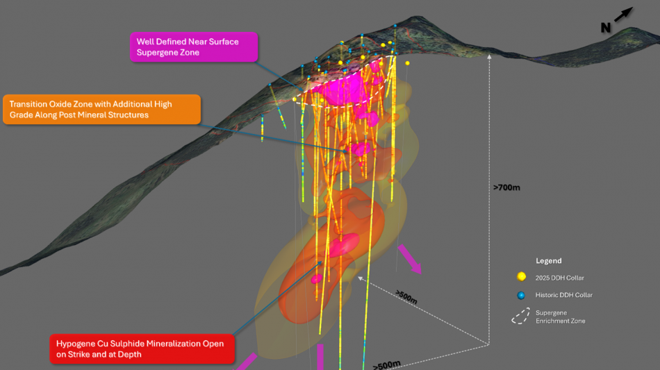 Mr. Jones continues, "The model highlights the vertical continuity of mineralization from surface through the oxide and transition zones into deeper sulphide domains, reinforcing the interpretation of a robust porphyry copper system. Importantly, deeper sulphide mineralization remains open, with limited drilling having tested the full vertical extent of the system."
