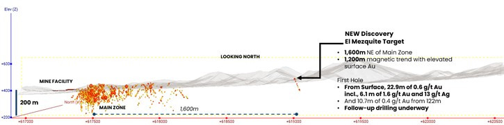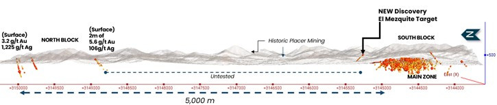 Figure 2. Cross-section view west to east across the South Block. El Mezquite target is 1,600m east of the Main Zone. The area between is just now being explored and drilled for the first time. Another 1,500m east is additional area just starting to be explored.