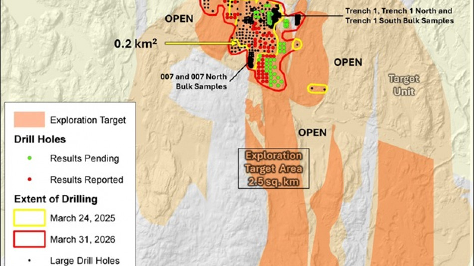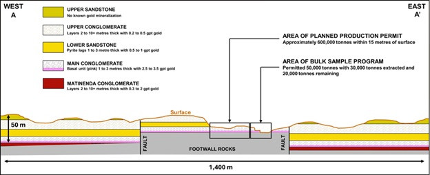 The Main Conglomerate layer remains the primary focus of ongoing Phase 2 drilling and forms the foundation of the Company's exploration target of 12.5 million tonnes at 3.5 g/t gold (See Technical Report April 10, 2018), and remaining open for expansion. This unit averages approximately 2 metres in thickness and hosts the highest-grade mineralization identified to date. Where the layer occurs within 15 metres of surface, it has been the focus of the Company's bulk sampling program, which has demonstrated strong and repeatable economics supporting its development potential. The Company is advancing the near-surface area of this unit toward a production permit and near-term development pathway, including ore sorting to upgrade material for direct shipping and processing. This strategy would minimize capital requirements and generating early cash flow to support the development of a larger-scale operation.