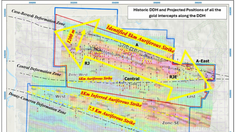 RJ Zone: A high-grade historic gold deposit with ~61,100 ounces identified at a grade of 7.82 g/t Au, with historical intercepts as high as 51 g/t Au over 0.8 metres and 16.5 g/t Au over 3.5 metres. This zone was last drilled by Agnico-Eagle Mines in 2008, when gold was ~US$800/oz. Only ~900 metres of strike has been drilled, with 4.75+ km remaining to be tested.