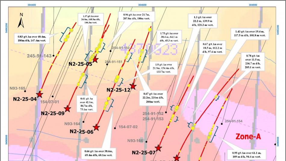 N2-25-004: 0.83 g/t Au over 40.4 metres beginning at 180.0 metres downhole, 147.4 metres vertical. Highlight interval includes 1.36 g/t Au over 9.0 metres with total metal index of 38.48.