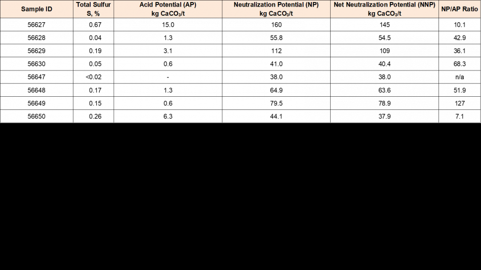 *An NNP of greater than 20 kg CaCO3/t and an NP/AP ratio of greater than 2.0 are generally utilized as criteria to classify a material as non-potentially-acid-generating. All previously-tested samples met these criteria.