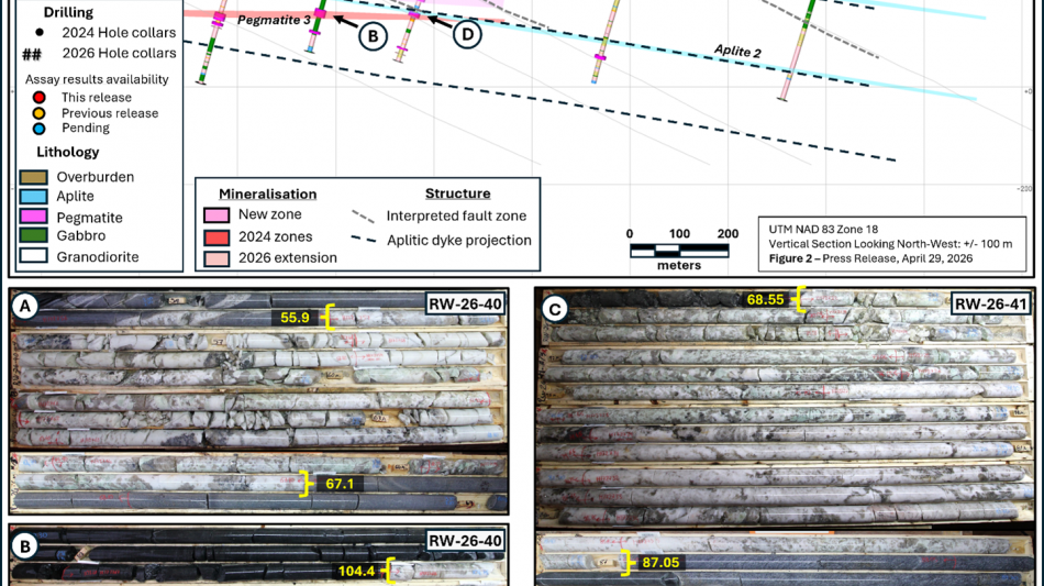 Covering an area of 500 m x 600 m, drilling to the south (RW-26-38 to RW-26-44) also intersected two significant pegmatites interpreted to be Pegmatite 5 (new) and Pegmatite 3; they show a thickness still in the range of 10-15 meters. Assay results for these holes are not yet available but are anticipated to reflect the concentration of spodumene observed in the core.