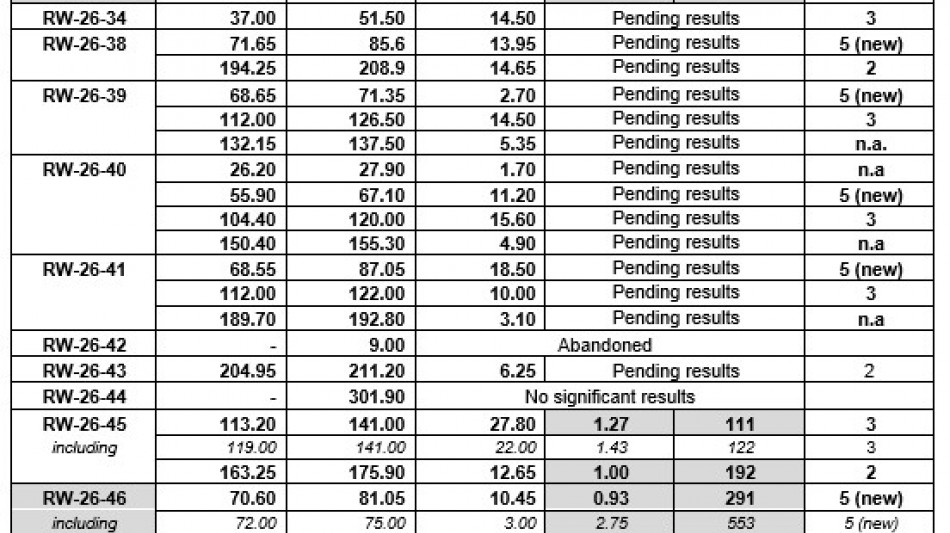 Assay results were received for holes RW-26-31 to 33, and RW-26-46 to 50, and returned some significant lithium and tantalum composite assays, as highlighted: