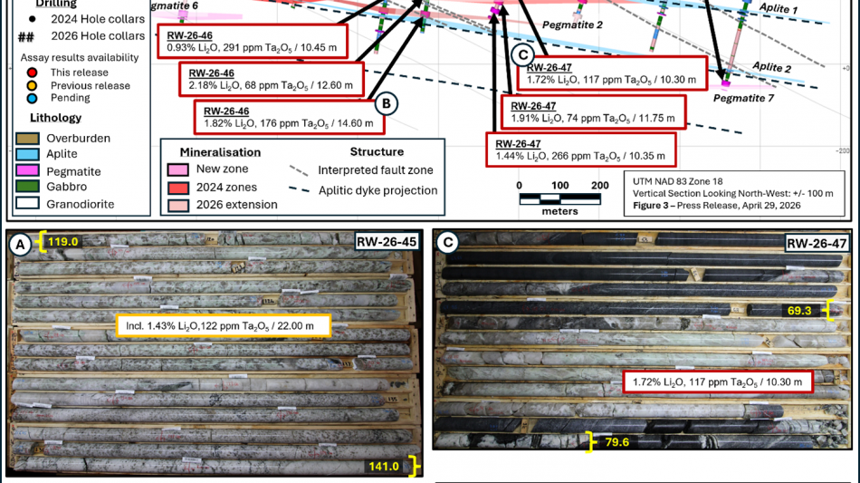 1.72% Li2O and 117 ppm Ta2O5 over 10.30 m (including 2.61% Li2O and 117 ppm Ta2O5 over 6.35 m), through Pegmatite 5 (new), in hole RW-26-47