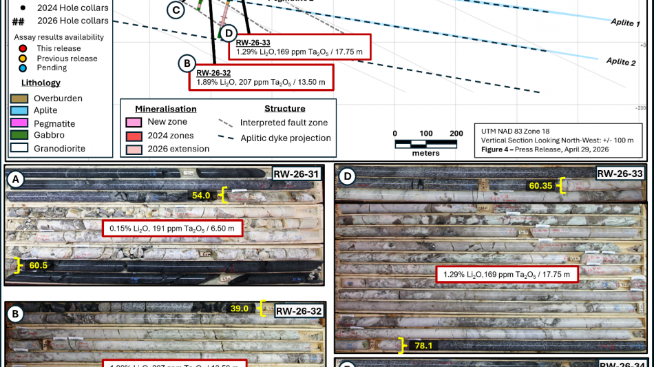 1.29% Li2O and 169 ppm Ta2O5 over 17.75 m (including 2.13% Li2O and 105 ppm Ta2O5 over 9.00 m), through Pegmatite 3 in hole RW-26-33
